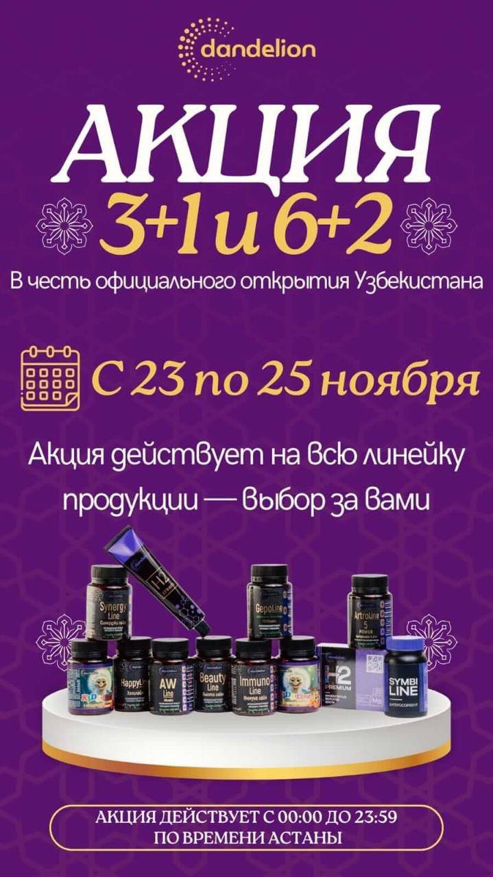 ДОЛГОЖДАННАЯ ЩЕДРАЯ АКЦИЯ! В честь официального открытия Узбекистана 3+1 и 6+2 на всю линейку продукции…